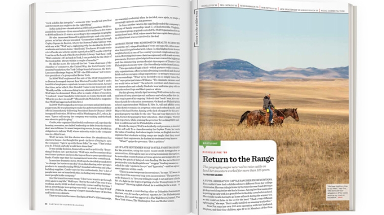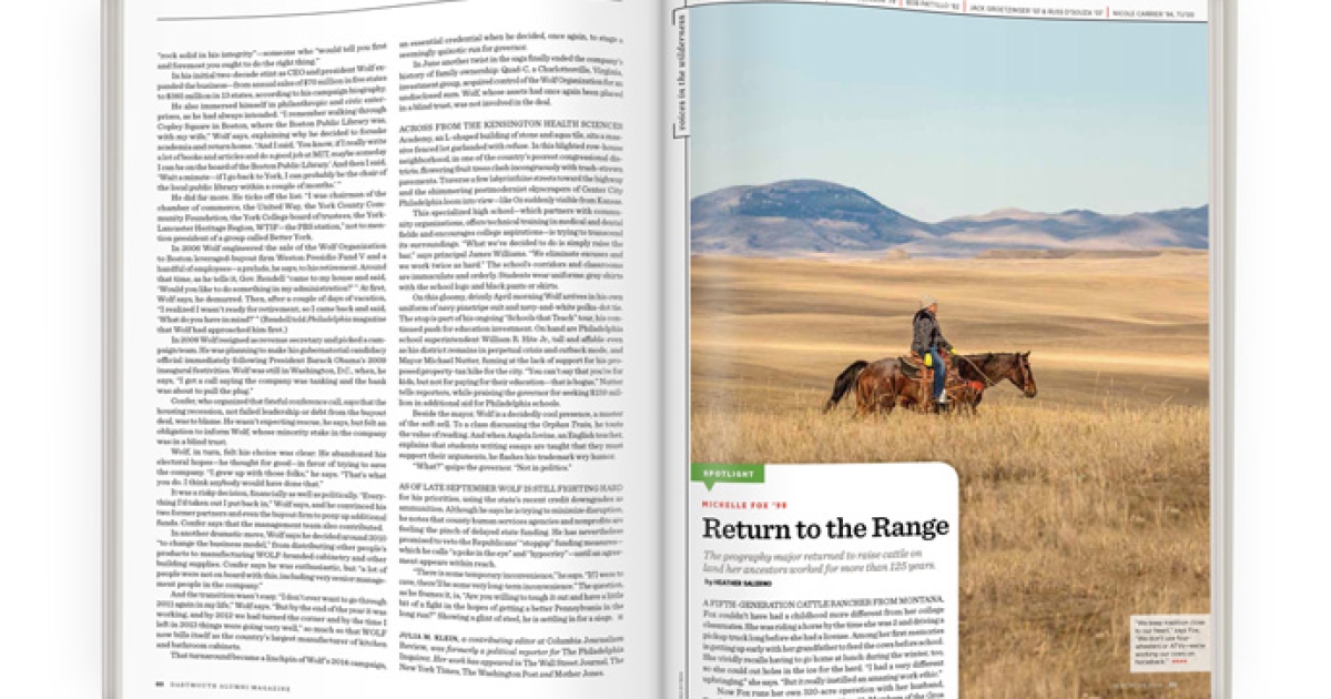 She moved back to Montana in 2008, and a year later helped found Island Mountain Development Group, a Native American economic development corporation, for which she still serves as CEO. Fox realized that she had missed not only her home state but also ranching, so in 2013 she and Stephen bought her late aunt’s ranch, about 15 miles from where Fox grew up. “Ranching isn’t something you just pick up and leave,” she says. “I went to Dartmouth because I didn’t want to be a rancher anymore. But it’s kind of funny how you come full circle. You realize this is what you’re meant to do and who you’re meant to be.” She hopes that her children will keep the family’s agricultural heritage alive. Each child is currently responsible for a small herd of cows; her youngest has even borrowed money from the local bank to buy heifers. “There’s so much history here for us,” says Fox. “It’s just part of who we are.” —Heather Salerno