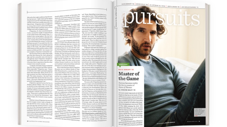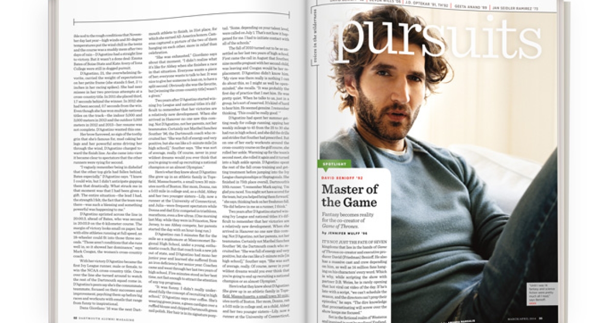 Although he’s one of Hollywood’s leading screenwriters now (his films include Troy, The Kite Runner and 25th Hour, which is based on his novel), Benioff initially didn’t make the cut when he applied for the creative writing program at Dartmouth. “When I came across David’s application, I found it dense, edgy and incomprehensible,” says professor Ernest Hebert. But when the young man went to plead his case, “he had this look on his face of despair and yearning. I knew I’d made a big mistake,” says Hebert, who went on to become Benioff’s advisor for his senior fellowship. “I’ve never had a student work harder,” he adds.