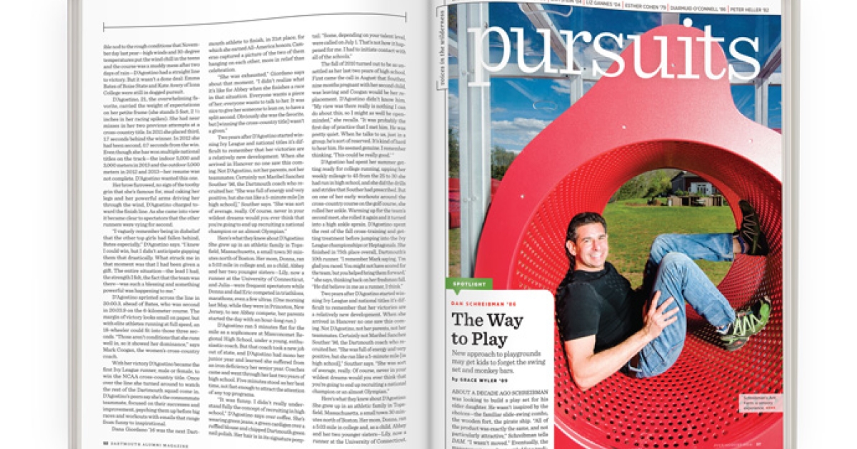 Designing playgrounds is a major change of pace for the Dartmouth religion and goverment major, who has spent two decades working as a consultant, and until recently had never worked in design or landscape architecture. “I probably missed my calling,” Schreibman says. “But at least I found it later in life.”