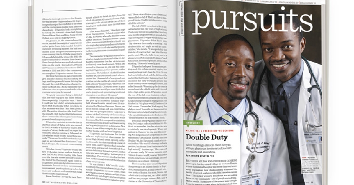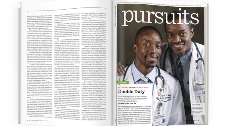 As depicted in a 2011 documentary, Honoring a Father’s Dream: Sons of Lwala, the brothers continue to live in two worlds. While they work to improve regional healthcare through LCA, they also practice medicine in the United States, Milton in internal medicine and gastroenterology in St. Louis, Missouri, and Fred through his last year of a residency at Vanderbilt in internal medicine and pediatrics. They credit their education with helping them achieve their goals. “If it weren’t for the friendships and connections that we made at Dartmouth, I don’t think we would have been able to realize our full potential,” Milton says. —Carolyn Kylstra ’08
