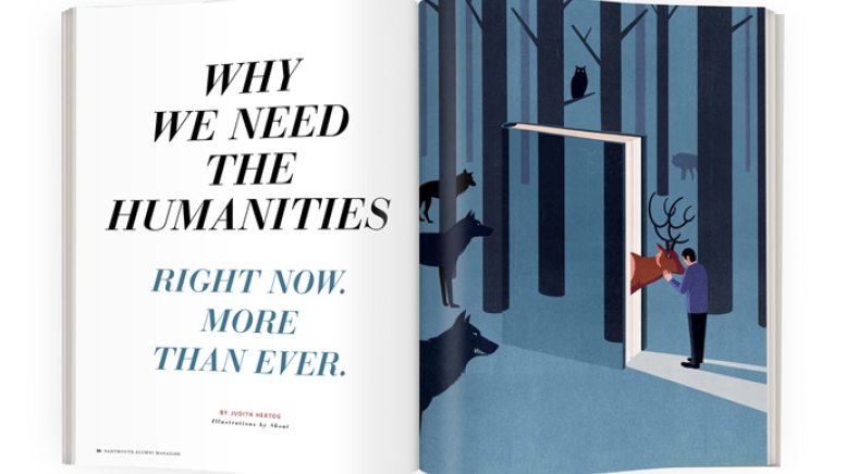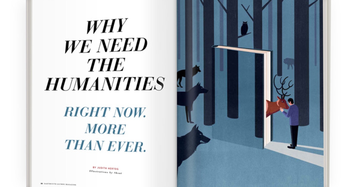 In 2014, 6 percent of American college students majored in the humanities, according to the American Academy of Arts and Sciences, down from 17 percent in 1967. At Dartmouth 15 percent of the class of 2015 majored in the humanities, a drop from 26 percent in the class of 1967. The number of freshmen who express an interest in the humanities prior to matriculating at Dartmouth is in steady decline—although some signs point to renewed interest once they arrive. (The College stipulates in its general education requirements that every undergraduate must take at least a sampling of humanities courses.)