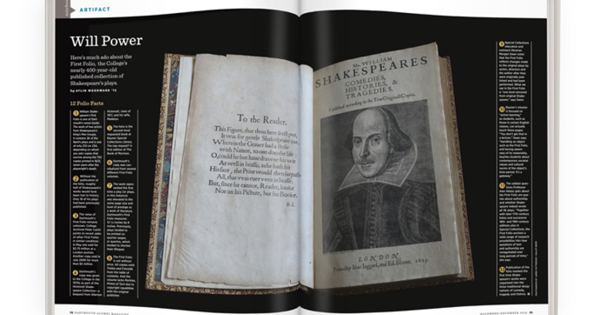 1. William Shakespeare’s First Folio is one of Dartmouth’s rarest books. The work of two actors from Shakespeare’s King’s Men troupe, it contains 36 of the Bard’s plays and is one of only 233 (or 234, depending on whom you ask) copies that survive among the 750 copies printed in 1623, seven years after the playwright’s death.