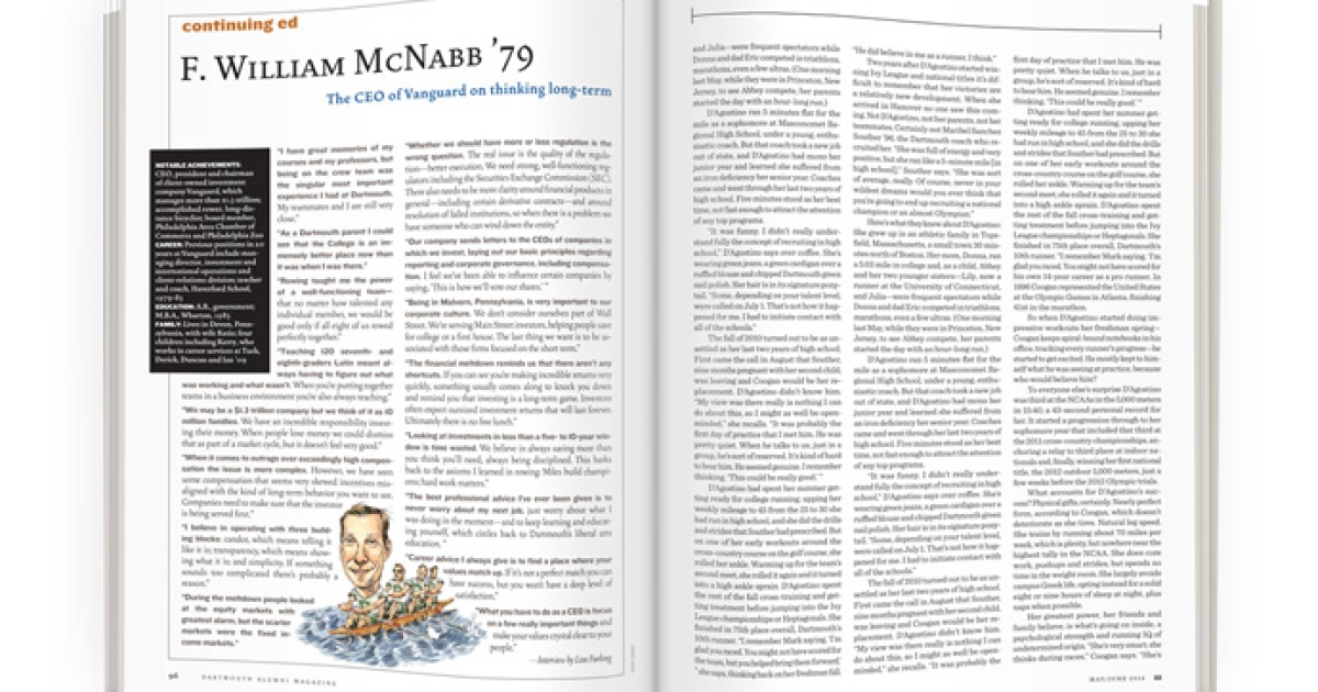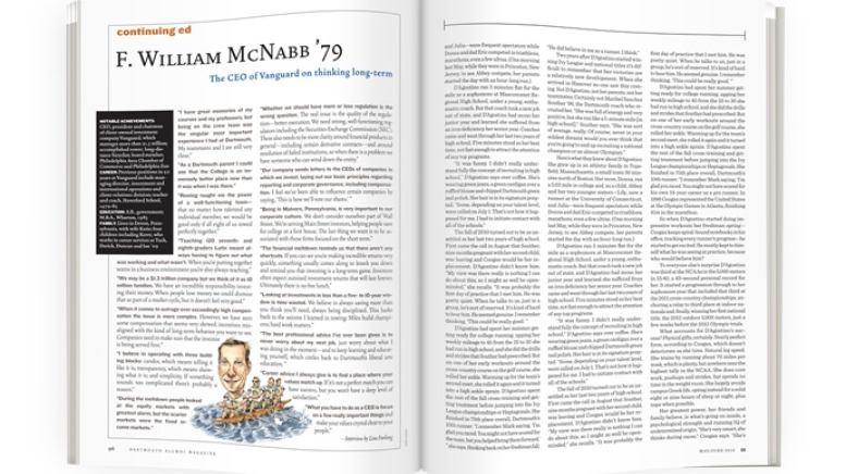 Notable Achievements: CEO, president and chairman of client-owned investment company Vanguard, which manages more than $1.3 trillion; accomplished rower, long-distance bicyclist; board member, Philadelphia Area Chamber of Commerce and Philadelphia Zoo Career: Previous positions in 20 years at Vanguard include managing director, investment and international operations and client-relations division; teacher and coach, Haverford School, 1979-83 Education: A.B., government; M.B.A., Wharton, 1983 Family: Lives in Devon, Pennsylvania, with wife Katie; four children including Kerry, who works in career services at Tuck, Derick, Duncan and Ian ’09