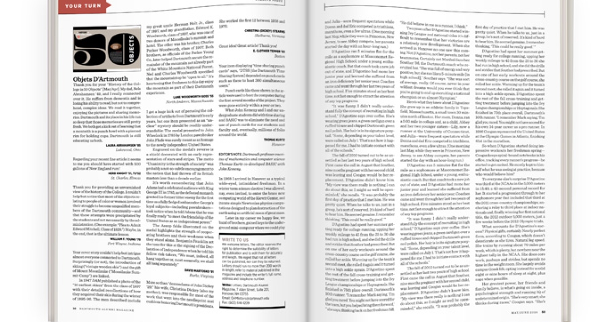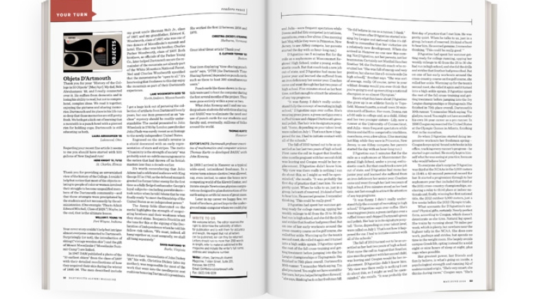 Thank you for your “History of the College in 50 Objects” [Mar/Apr]. My dad, Nels Abrahamsen ’49, and I really connected over it. He suffers from dementia and is losing his ability to read, but not to comprehend, complex ideas. We read it together, enjoying the pictures and sharing memories. Dartmouth and its place in his life run so deep that those memories are still pretty fresh. We both got a kick out of learning that a monteith is a punch bowl with a pierced rim for holding cups. Dartmouth is still educating us both.