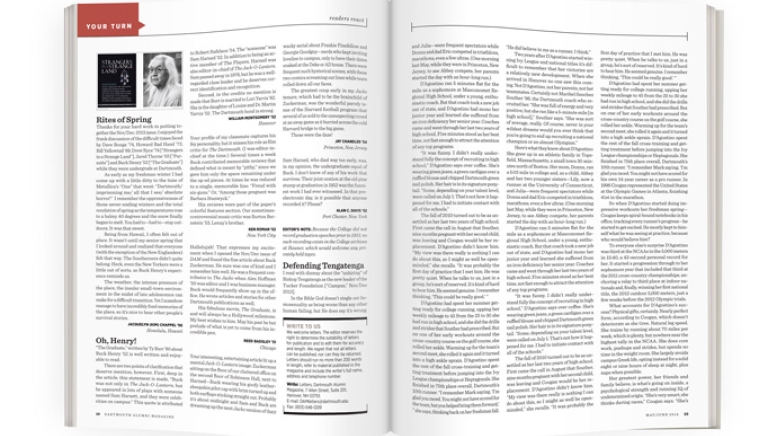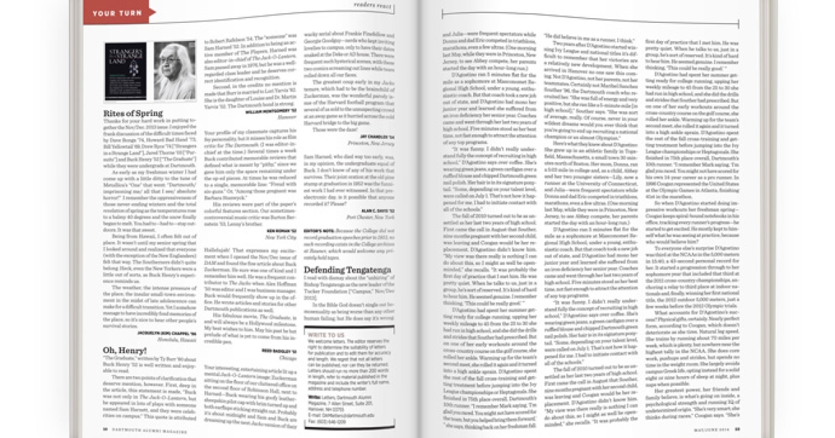 Thanks for your hard work in putting together the Nov/Dec. 2013 issue. I enjoyed the frank discussion of the difficult times faced by Dave Bonga ’74, Howard Bad Hand ’73, Bill Yellowtail ’69, Drew Ryce ’74 [“Strangers in a Strange Land”], Jared Thorne ’03 [“Pursuits”] and Buck Henry ’52 [“The Graduate”] while they were undergrads at Dartmouth.