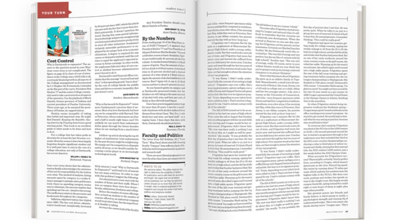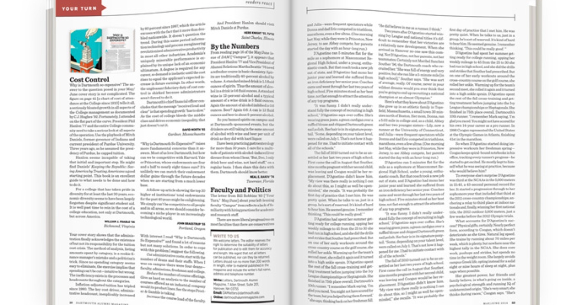 Why is Dartmouth so expensive? The answer to the question posed in your May/June cover story is not complicated. The figure on page 41 [a chart of cost of attendance at the College since 1910] tells it all, a seriously bloated growth in all aspects of the College management as documented by C.J. Hughes ’92. Fortunately, I attended on the flat part of the curve. President Phil Hanlon ’77 and the entire College community need to take a serious look at all aspects of the operation. Use the playbook of Mitch Daniels, former governor of Indiana and current president of Purdue University. Three years ago, as he assumed the presidency of Purdue, he capped tuition.