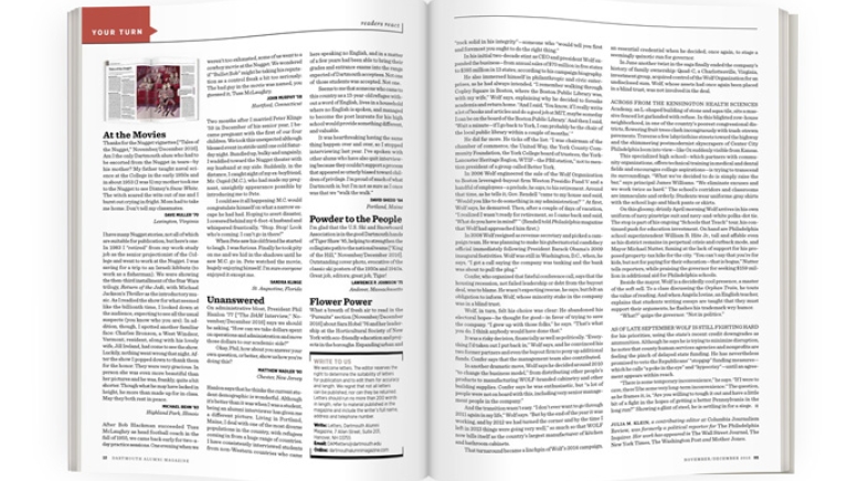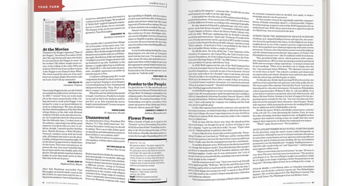 I’m glad that the U.S. Ski and Snowboard Association is in the good Dartmouth hands of Tiger Shaw ’85, helping to strengthen the collegiate path to the national teams [“King of the Hill,” November/December 2016]. Outstanding cover photo, evocative of the classic ski posters of the 1930s and 1940s. Great job, editors; great job, Tiger!