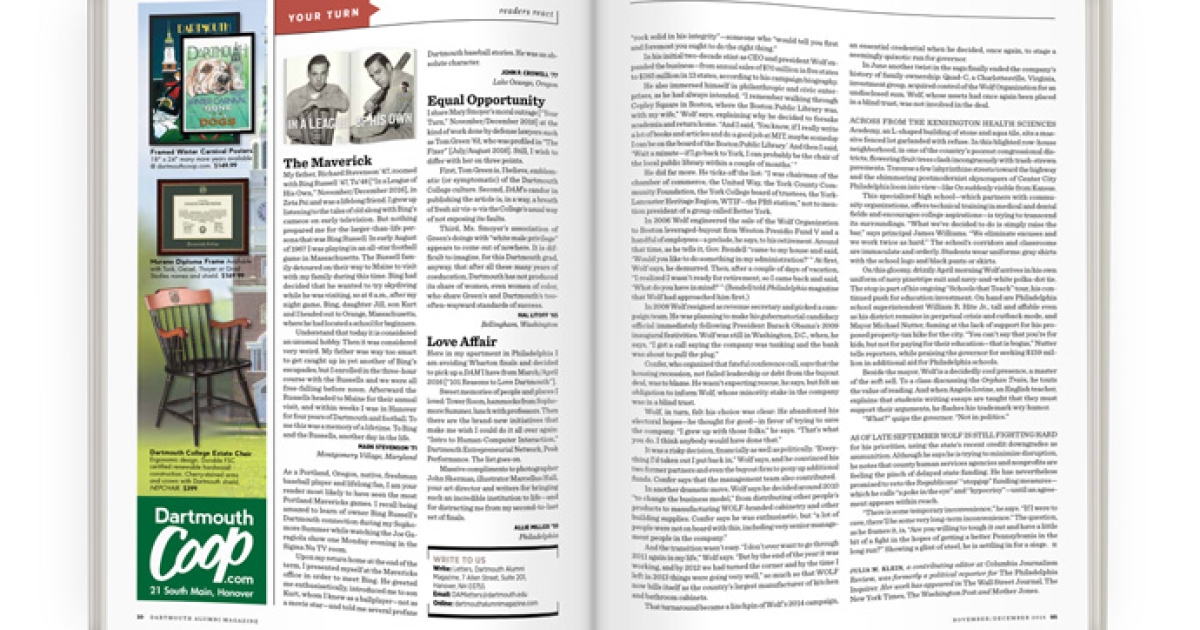 Third, Ms. Smoyer’s association of Green’s doings with “white male privilege” appears to come out of nowhere. It is difficult to imagine, for this Dartmouth grad, anyway, that after all these many years of coeducation, Dartmouth has not produced its share of women, even women of color, who share Green’s and Dartmouth’s too-often-wayward standards of success.
