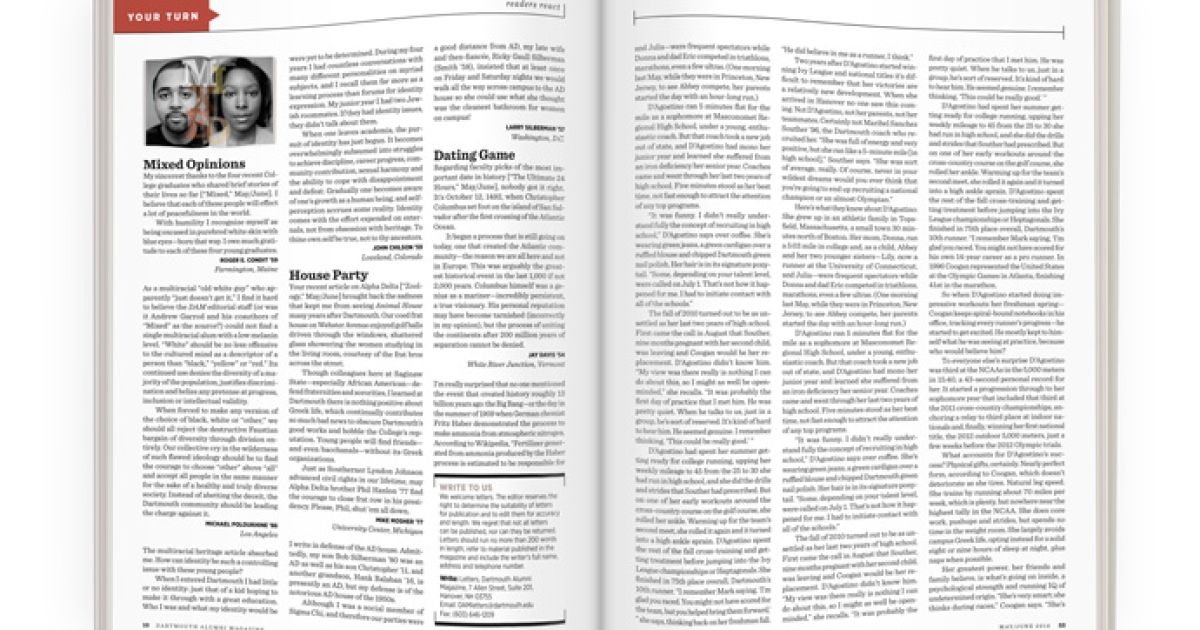 As a multiracial “old white guy” who apparently “just doesn’t get it,” I find it hard to believe the DAM editorial staff (or was it Andrew Garrod and his coauthors of “Mixed” as the source?) could not find a single multiracial alum with a low melanin level. “White” should be no less offensive to the cultured mind as a descriptor of a person than “black,” “yellow” or “red.” Its continued use denies the diversity of a majority of the population, justifies discrimination and belies any pretense at progress, inclusion or intellectual validity.