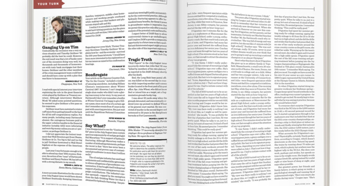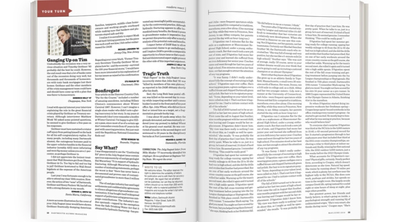 Regarding your cover blurb, “Former Treasury Secretary Timothy Geithner ’83 explains how he—and the economy—survived the 100-year financial storm,” I would have been more interested in his explanation of his tax issues as raised at his confirmation hearings.