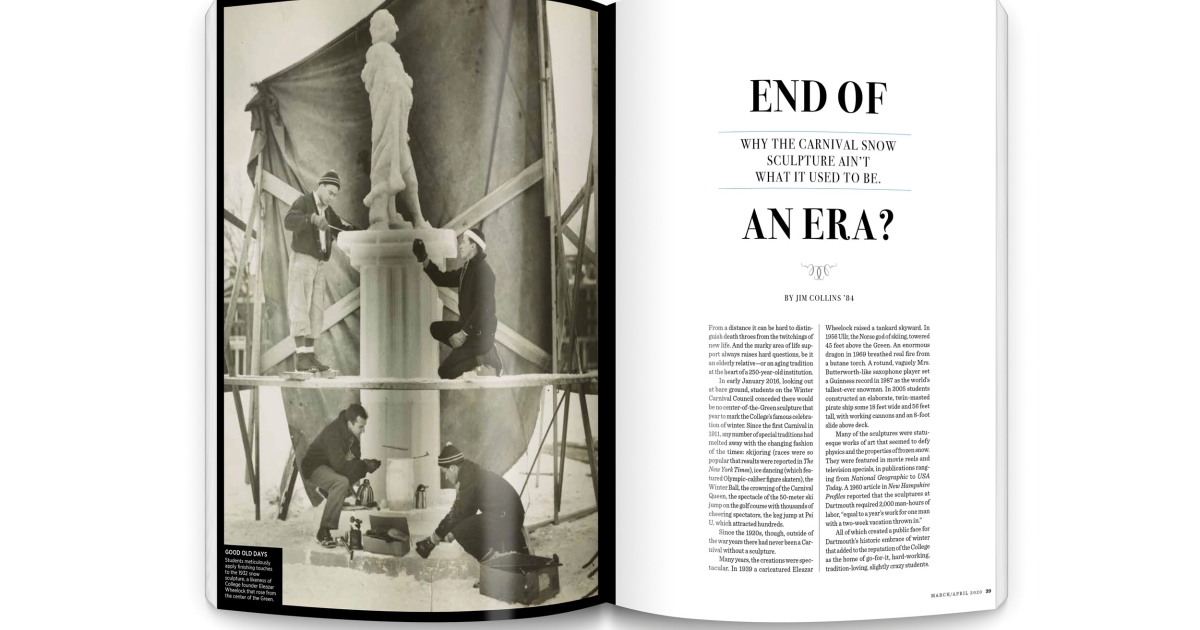 I enjoyed reading the article by Jim Collins ’84 about the Winter Carnival snow sculpture [“End of an Era?,” March/April]. I was a four-year veteran of center-of-the-Green snow sculpting (1980-83). One year was particularly noteworthy. In 1980 there was no snow, so a bunch of us on the Carnival Council managed to have snow blown on to the Green. As memory serves, the key hurdles were getting the town of Hanover to donate a few million gallons of water and getting Killington to loan us three snowblowers and an operator. The Hanover Inn gave the operator a place to stay, and a fire truck with a pump large enough to blow snow was driven up from New Orleans. Yes, my grades suffered from spending so much time building snow sculptures. On the other hand, I fondly remember my fellow Carnival Council friends and cherish those memories. They are an amazing group of people, and I consider myself lucky to have been a part of that. I’d do it all over again.