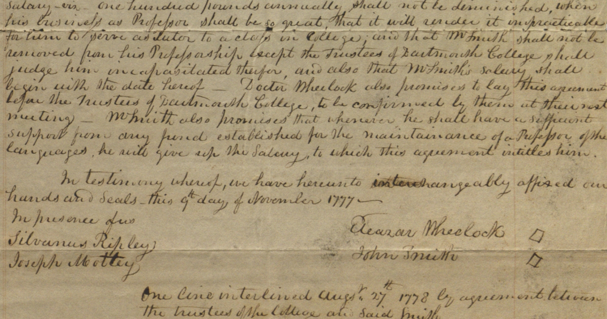 Dr. Wheelock agrees to give him (the said Mr. Smith) one hundred pounds annually as a salary to be paid one half in money and the other half in money or in such necessary articles for a family as wheat, Indian corn, rye, beef, pork, mutton, butter, cheese, hay, pasturing, etc., as long as he shall continue professor as aforesaid, and that he shall have these articles delivered to him at the same price for which they were usually sold before the commencement of the present war in America. Doctor Wheelock also agrees that Mr. Smith’s salary shall not be diminished when his business as professor shall be so great that it will render it impracticable for him to serve as a tutor to a class in College.