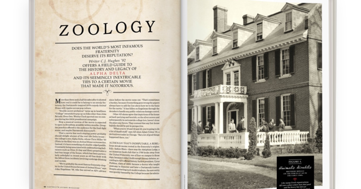 That a movie has such staying power probably should delight alumni of the real-life Delta house—the college’s own Alpha Delta, whose Chris Miller ’63 (Pinto in the film) was an Animal House screenwriter. Instead, it’s been something of a double-edged paddle. Constantly being associated with underachieving hell-raisers such as Otter, D-Day and Bluto perpetuates a bad-boy image of the house, which has been particularly unhelpful in recent years as AD has dealt with the fallout from incidents involving underage drinking and racism.