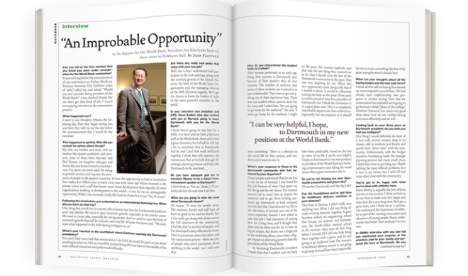 Features “An Improbable Opportunity” As he departs for the World Bank, President Jim Kim looks back on three years in Parkhurst Hall.