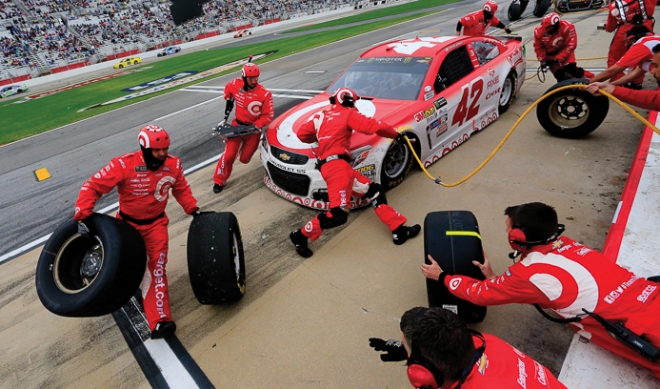 Features In the Pits Ten seconds of terror: NASCAR coach Shaun Peet ’98 guides you into the danger zone.