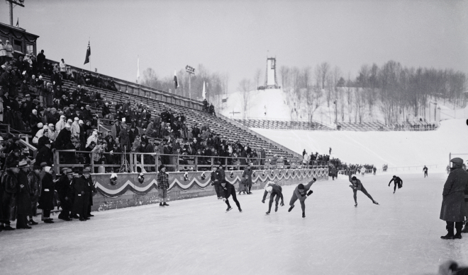Speed skater Jack Shea ’34, competing in his hometown of Lake Placid, New York, wins the second heat of the 1,500-meter race en route to becoming the first American to win two gold medals at one…