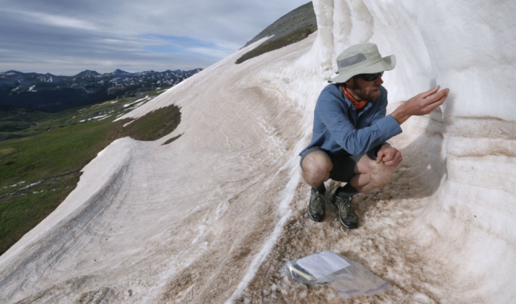 McDonald takes a sample of snow from high in the headwaters before following the river downhill during the Disappearing Rio Grande Expedition in 2014. (Courtesy Erich Schlegel/Disappearing Rio Grande Expedition)