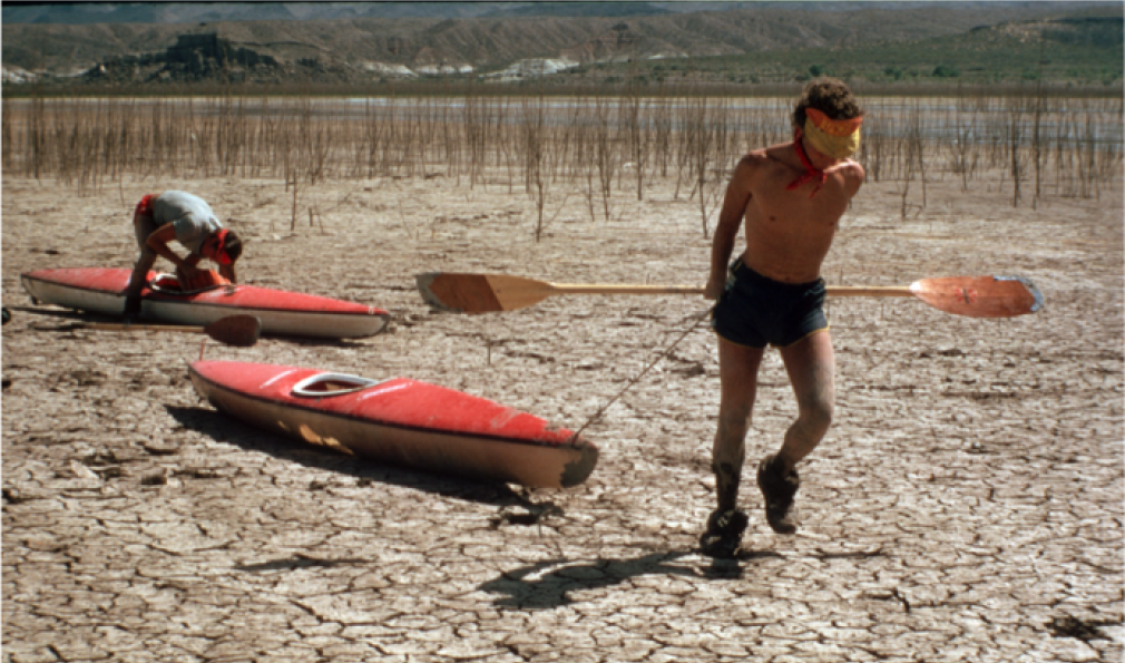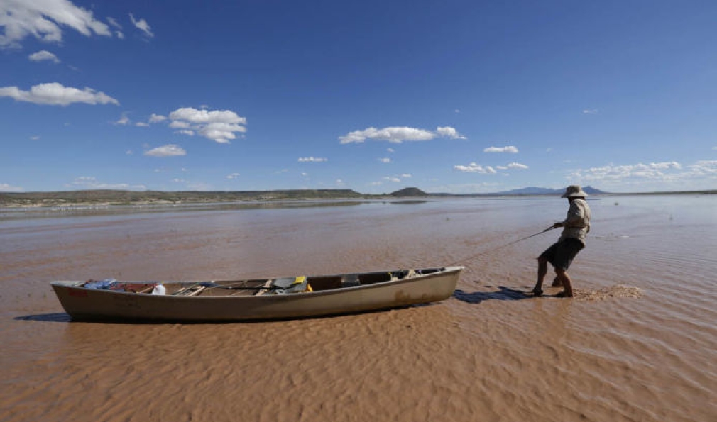 Elephant Butte Reservoir—only 7 percent full at the time this photo was taken—offers more opportunities to drag over mud than paddle in deep water. (Courtesy Erich Schlegel/Disappearing Rio Grande Expedition)