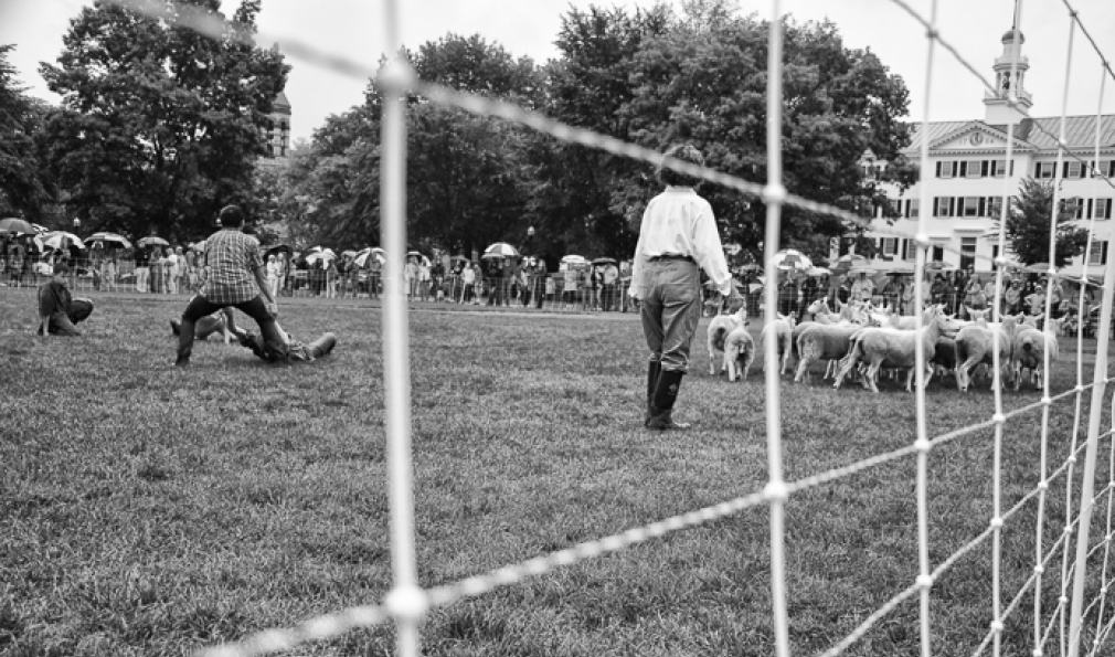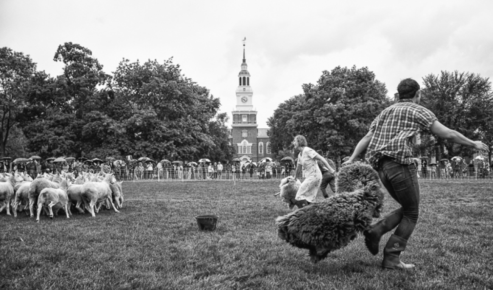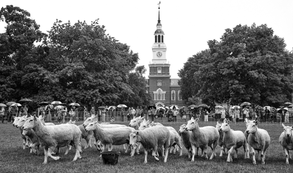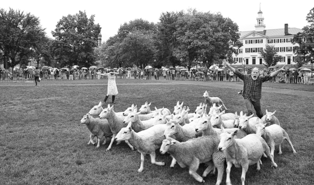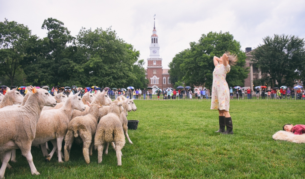 A herd of sheep. Three sheepdogs. And five human actors. All converged on the Green June 29 for the public debut of Doggie Hamlet, a performance loosely based on the novel, The Story of Edgar Sawtelle, which is loosely based on Shakespeare’s Hamlet. Created, choreographed and directed by dancer Ann Carlson, the Hopkins Center-sponsored show featured a mix of improvised movement and dance, some yelling at and chasing of sheep, and minimal dialogue.