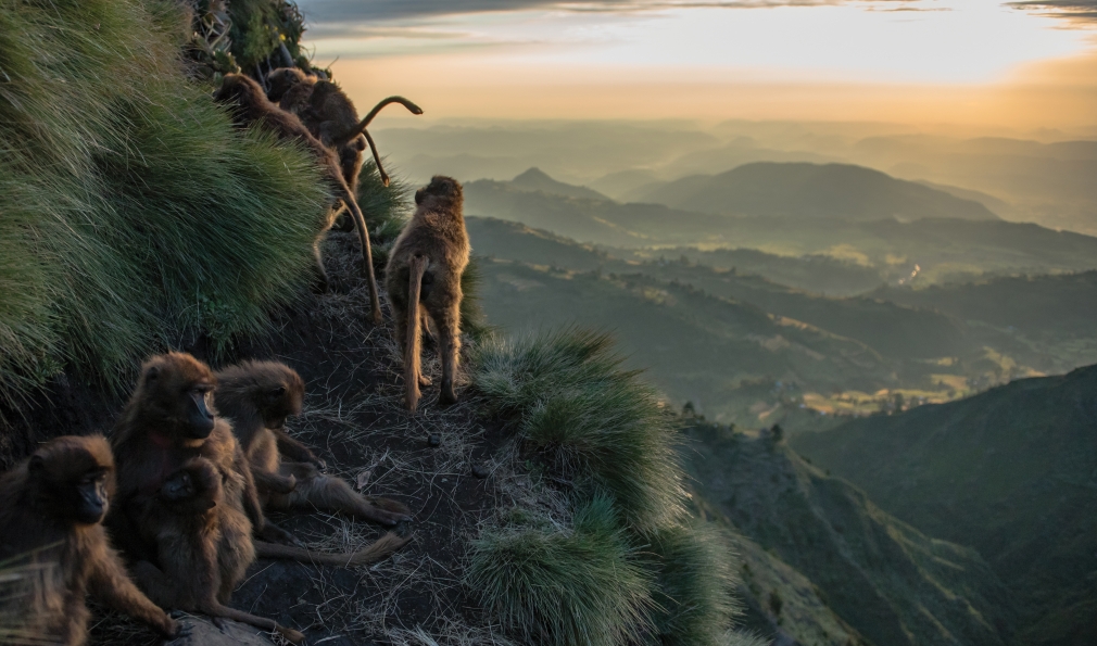 A family of gelada monkeys rises at dawn on a cliff in the Ethiopian Highlands.
