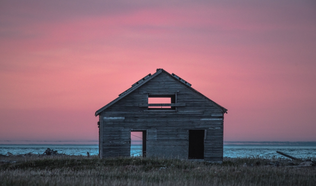 An abandoned Anglican mission house sits meters above sea level in the Canadian Arctic.