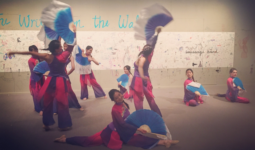 Students from the Dartmouth Asian Dance Troupe perform in the Kim Gallery. (Courtesy Alison Palizzolo)