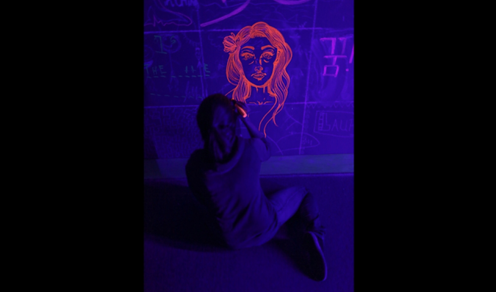 A visitor creates patterns on the walls with chalk under the black lights. (Courtesy Rob Strong)