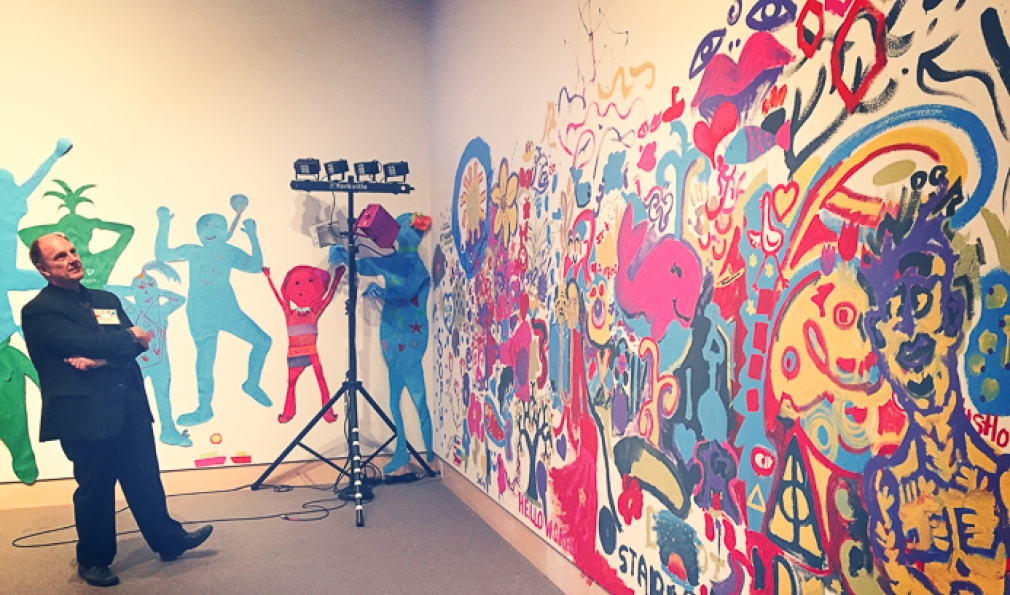 Hood Director John Stomberg admires one of the wall murals that nearly 1,600 visitors helped to create. (Courtesy Alison Palizzolo)