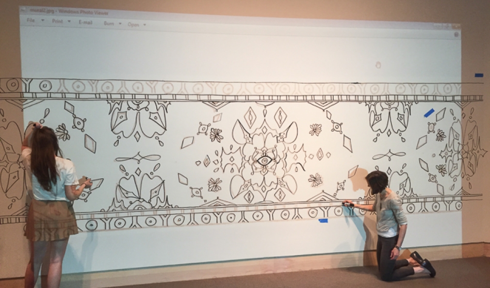 Eva Munday ’16 (left), the Hood Museum Class of 1954 Intern, created this design for the paint-by-numbers mural activity. (Courtesy Matt Zayatz)