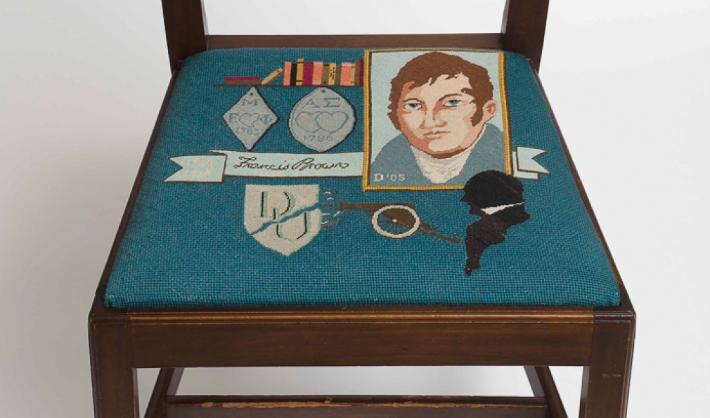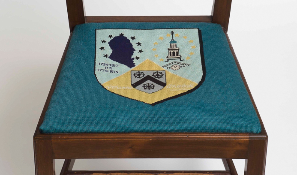 The College founder’s seat cushion features the Wheelock coat of arms (three Catherine wheels), a bible, drum and a scene of Wheelock Eleazar with a Native American.