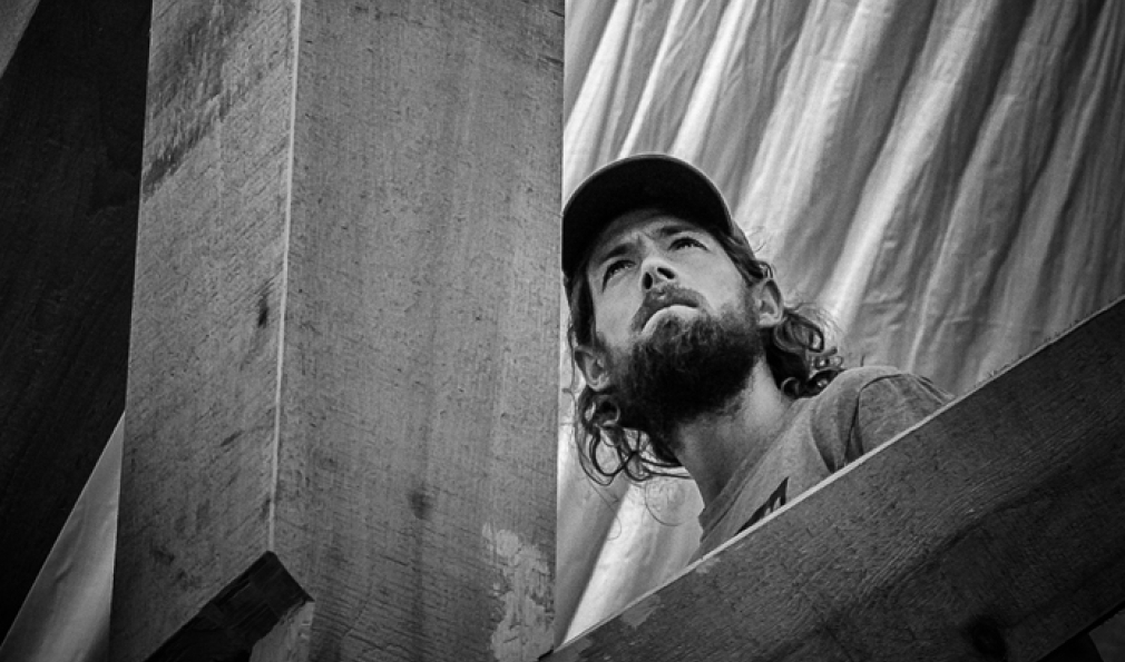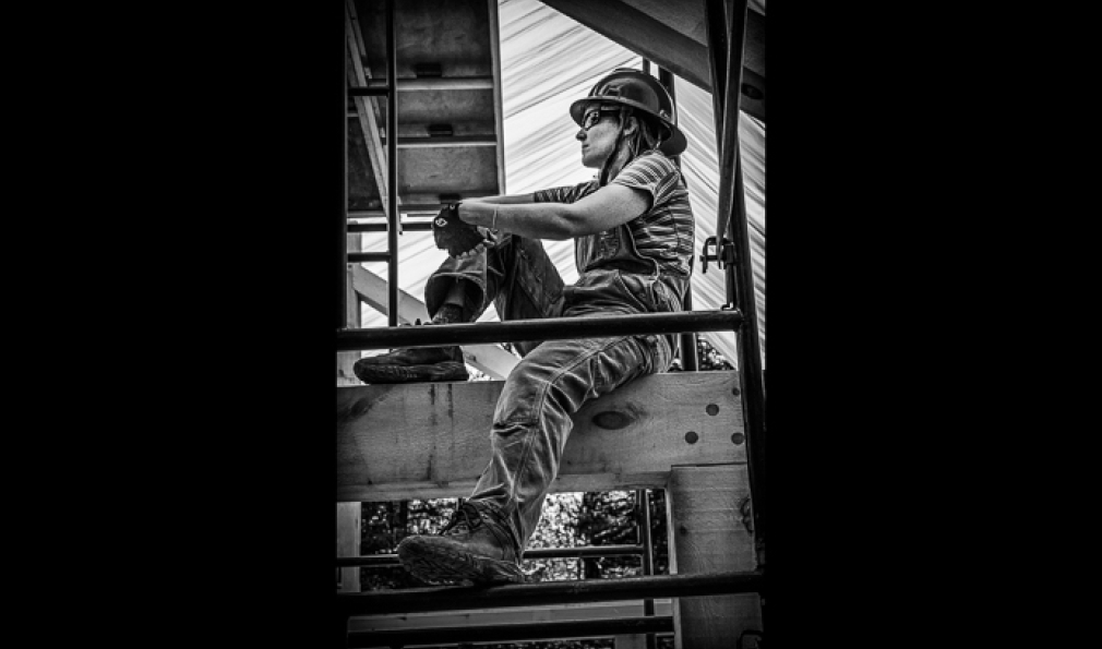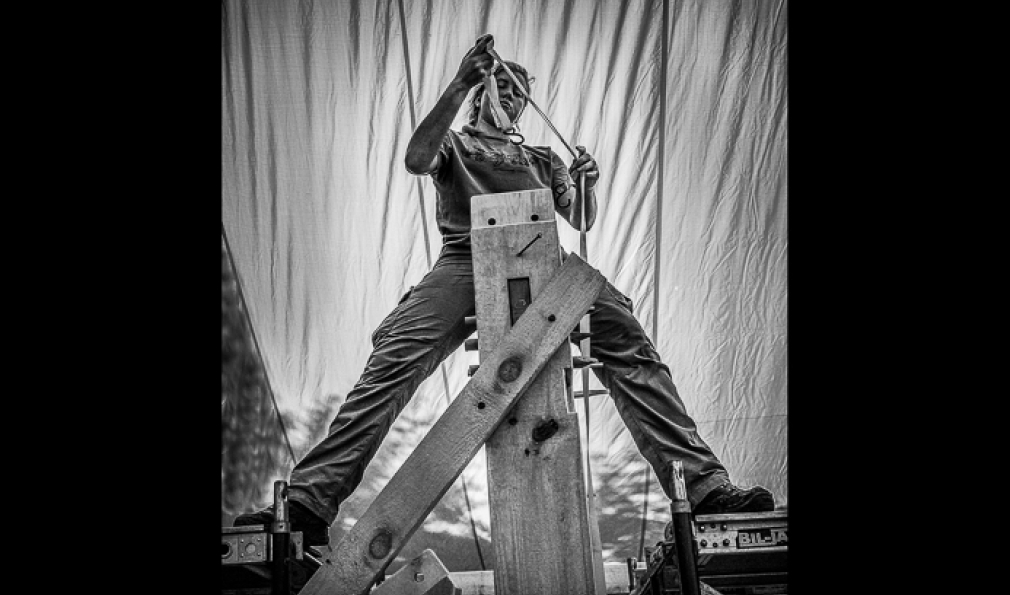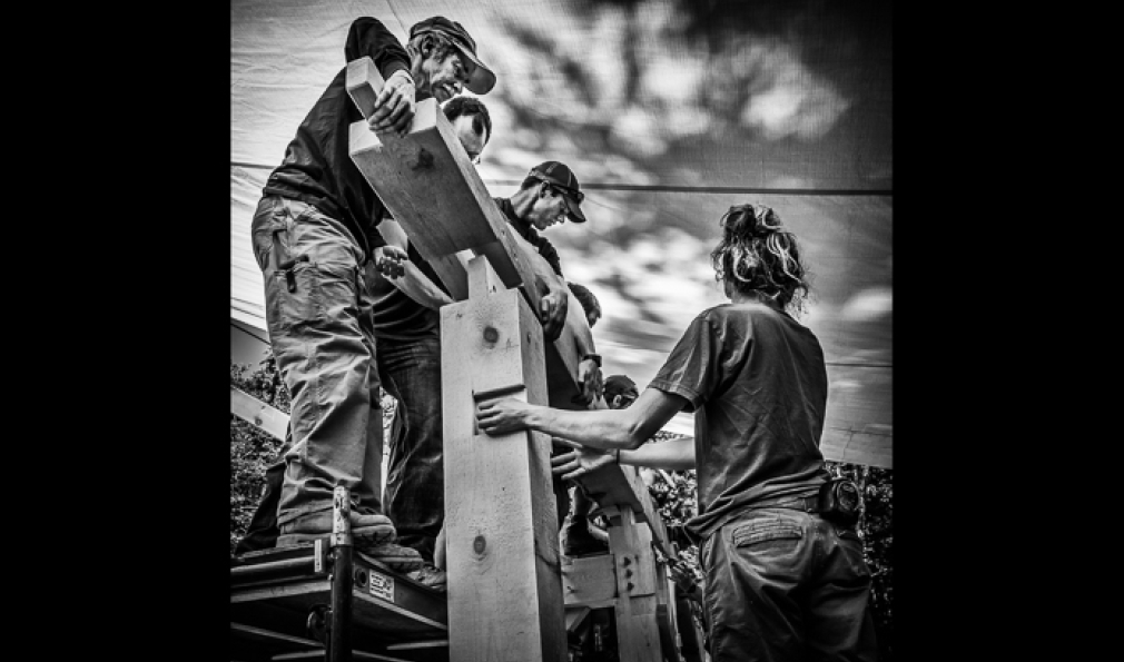 Dana Wieland ’17 prepares to rig a timber brace prior to setting a top-of-wall plate timber.