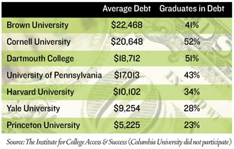 College seniors nationwide who graduated in 2010 carried an average of $25,250 in student loan debt. For many graduates in the Ivy League, the debt load was below the national average. Below are Ivy averages and the percentage of graduates with debt.